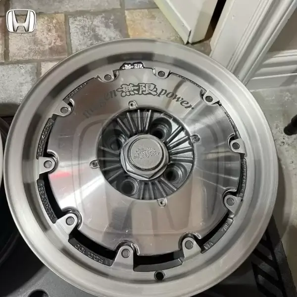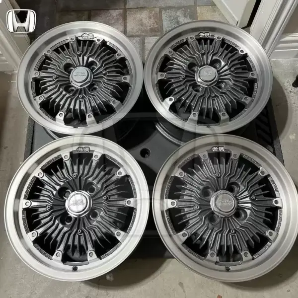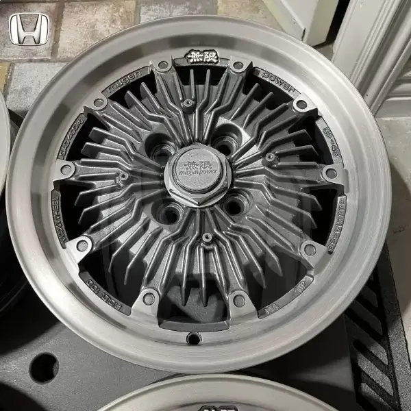 14x6 +38 4x100 Mugen cf48 Wheels professionally restored to a machine Rest of wheel was powdercoated Center caps and Aero discs are in original finish